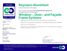 Nel 2024, il Cradle to Cradle® Product Innovation Institute ha lanciato un nuovo standard più rigoroso. Al momento della stesura di questo testo (dicembre 2025), Reynaers Aluminium offre 15 prodotti certificati Cradle to Cradle® al livello Full Scope Bronze secondo la versione 4.1. Di seguito, una panoramica dei nostri sistemi certificati: